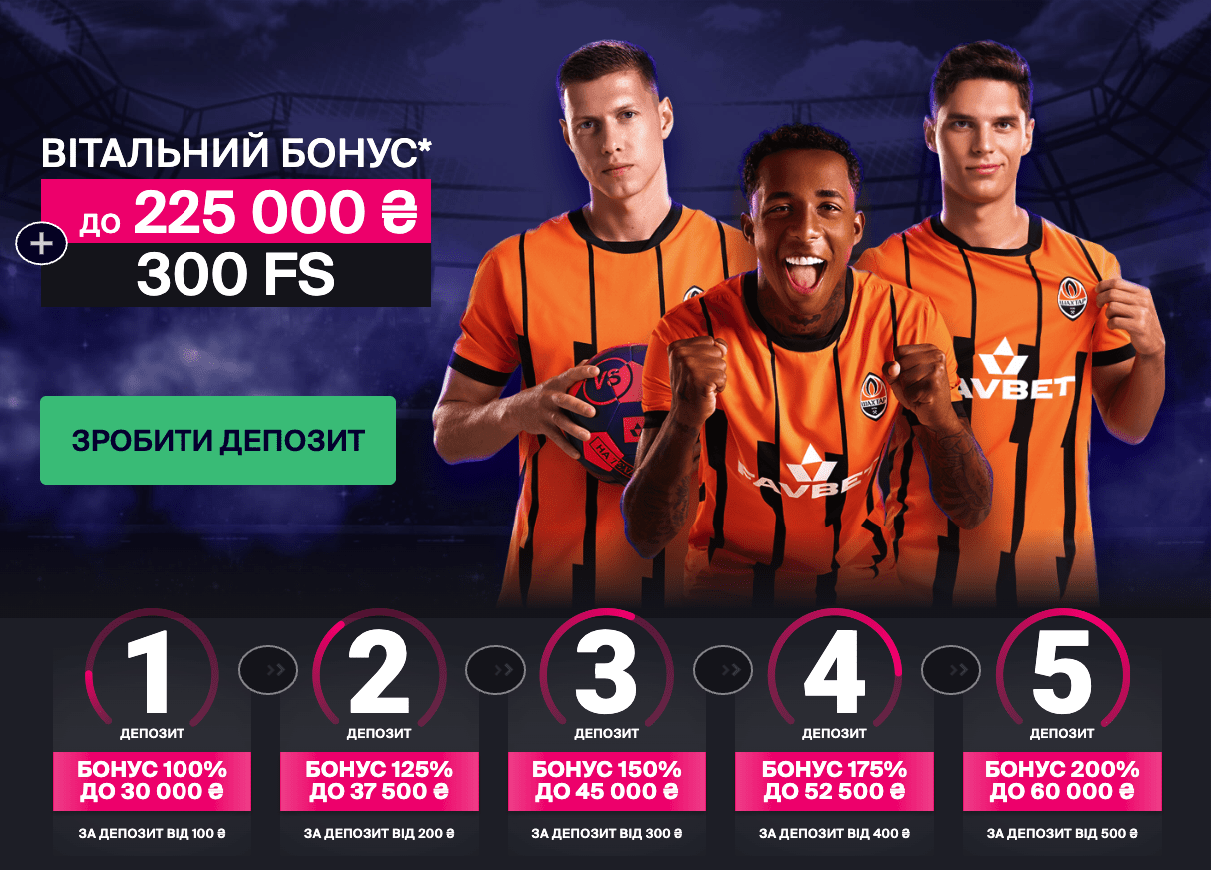 | Вітальний бонус | До 225 000 UAH + 300 FS |