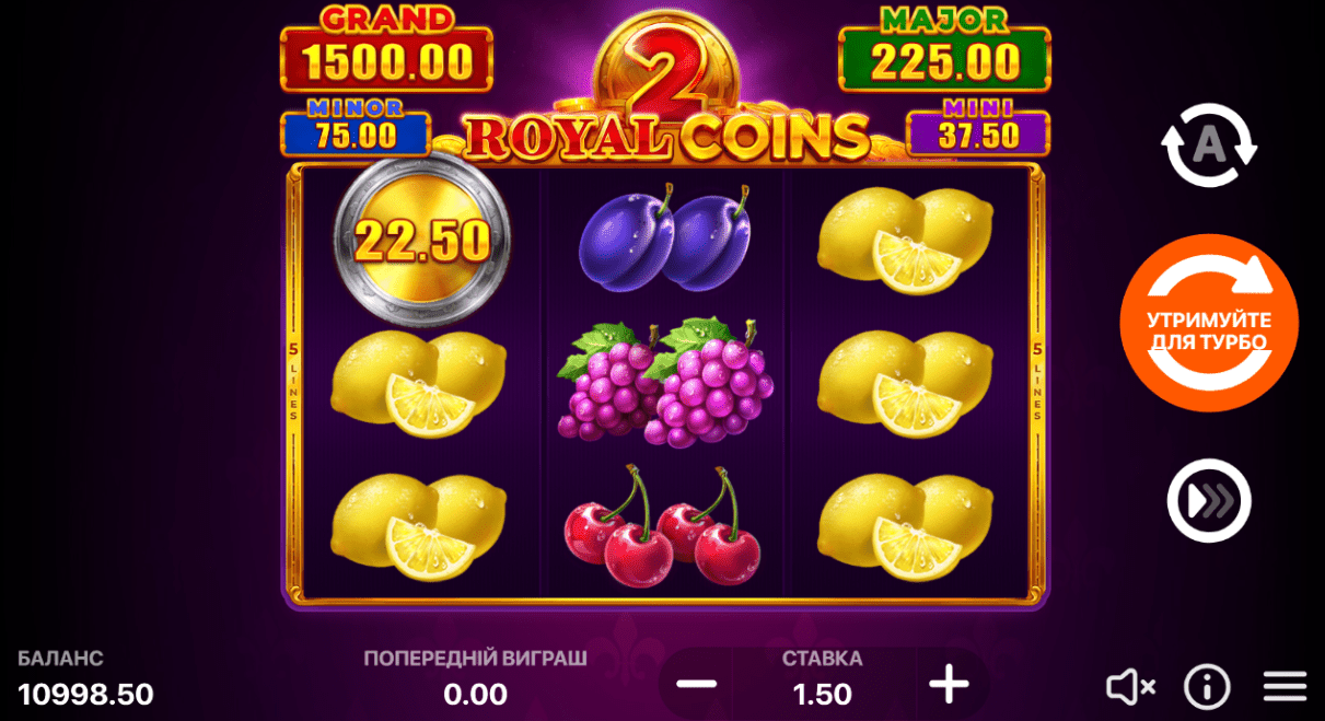 Ігровий автомат Royal Coins 2: Hold and Win — це онлайн слот, розроблений компанією Playson. Він має три барабани, три ряди, п’ять ліній виплат, RTP 95,64% та високу дисперсію. Це традиційна гра на фруктову тематику, яка пропонує захоплюючий геймплей та можливість виграти значні призи. У цій статті ми детально розглянемо функції, символи та особливості цього ігрового автомата.