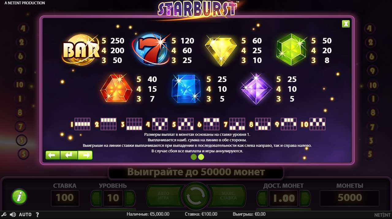 Головна особливість slot Starburst полягає у наявності опції win both ways. Відповідно до неї призові комбінації на ігровому майданчику зараховуються в обидві сторони.